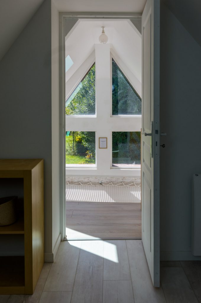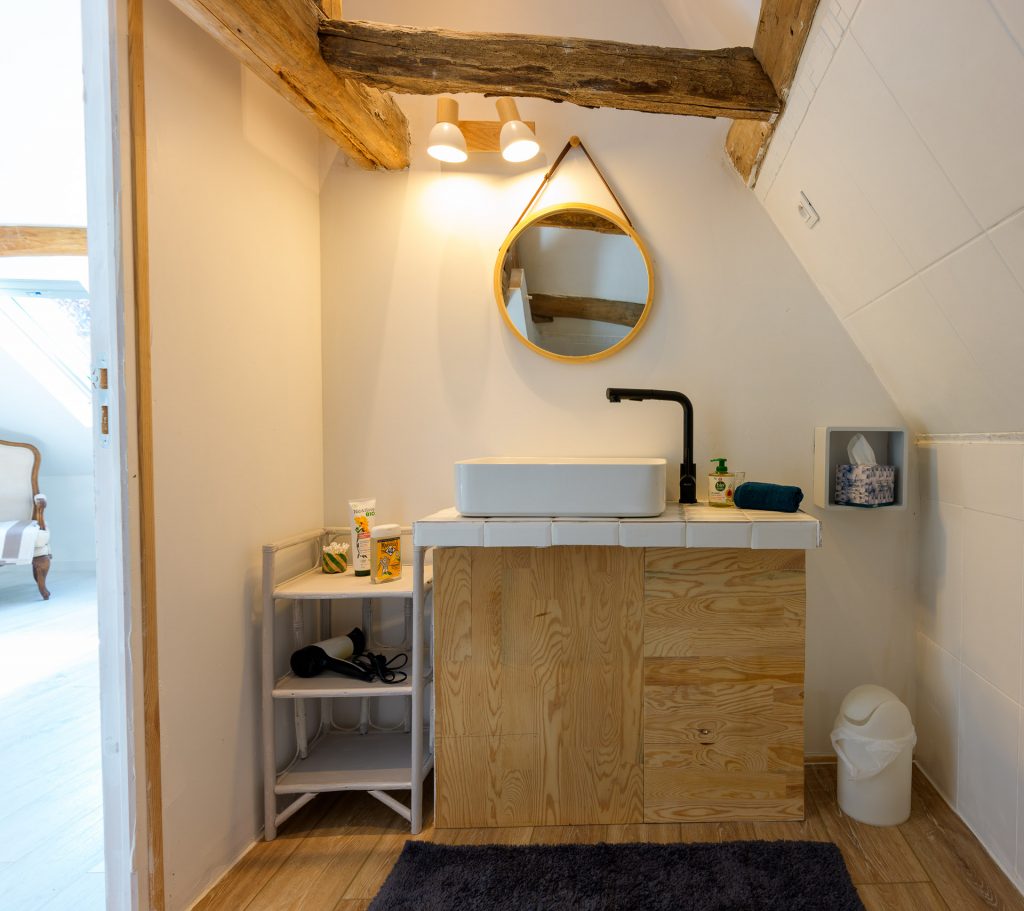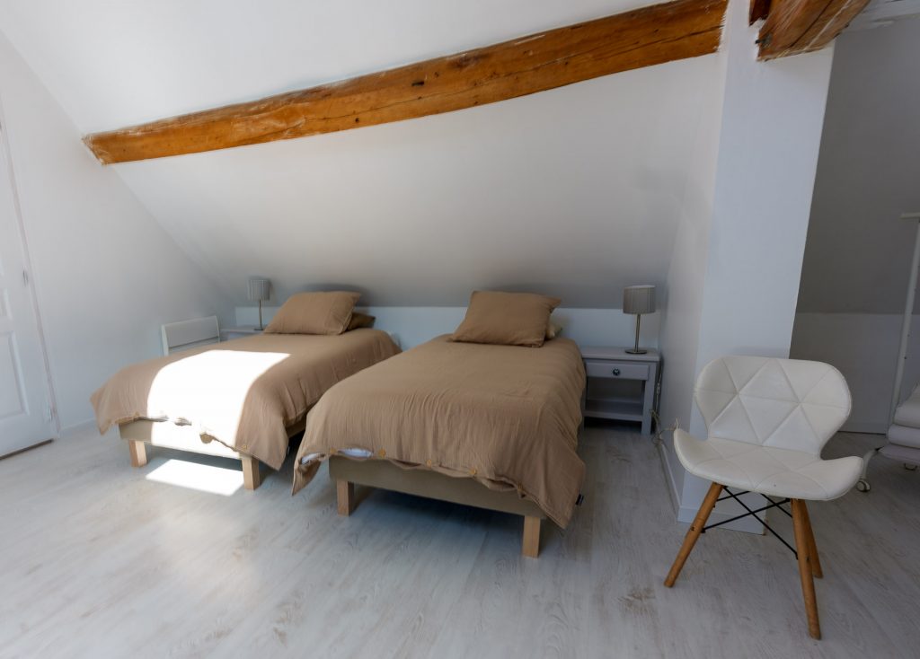 A l’étage, juste à côté de la suite, les 2 chambres communicantes sous les toits disposent chacune d’un lit simple (90 x 200 cm).