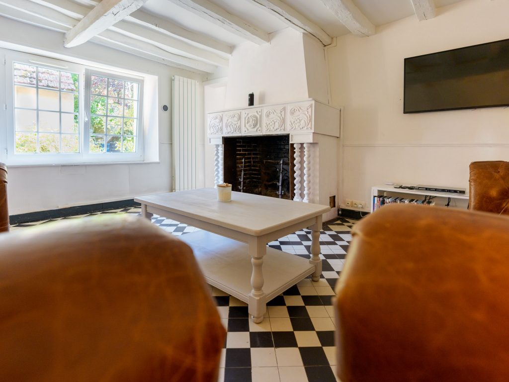 Dans la continuité de la longère, un charmant salon traversant avec cheminée et fauteuils enveloppants, propice à la lecture ou aux jeux de société. Ambiance feutrée pour vos soirées conviviales.